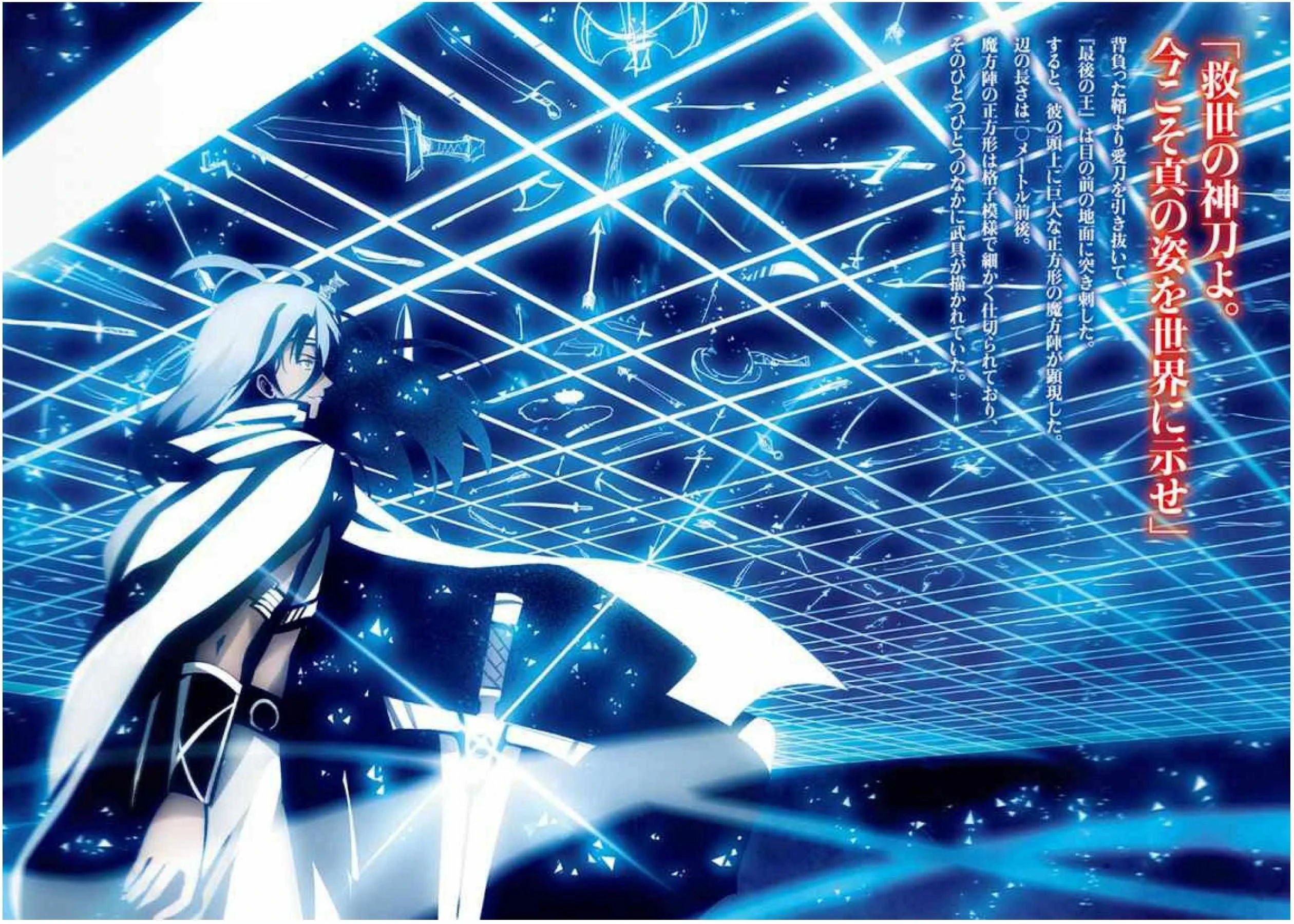 Divine Sword of Salvation is a weapon meant to slay Campione. Because of this, it can hurl incredible destructive force in the form of a barrage of lightning bolts. When used at higher power, this lightning bolts become tipped with iron weapons. If a Campione is struck by these weapons, they find their superhuman recovery is useless, as the wounds will heal as if the victim was a normal human. Even healing Magic is useless at speeding up recovery. Only by triggering the Campione's natural reaction to combat with a Heretic God can the curse be broken. The true form of its attack is the Divine Sword Mandala, which creates a mandala above the King of the End filled with images of weapons, any of which can be summoned for use, or used in a barrage against enemies.