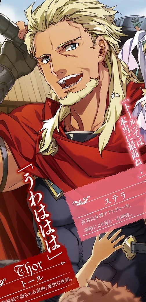 - Mjölnir: It is a iron hammer with a short handle that is difficult to hold in one hand. It is heavy, and every time it is swung downward, it strikes enemies with lightning. When thrown, it flies in a straight line through the sky, surrounded by lightning and thunderous explosions, and when swung with the words of lightning, it fills the sky with storm clouds and rains down thousands of lightning bolts over a vast area, scorching hordes of giants. The attack is capable of reducing everything to ashes.